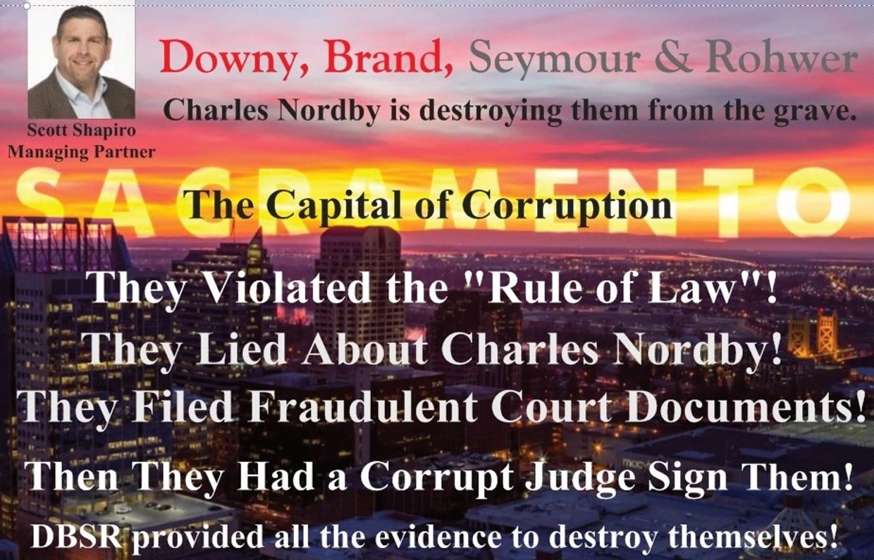 Scott Shapiro, your law firm destroyed Charles Nordby using lies, fraud, deception and corruption. Now he is going to destroy your law firm with all of the evidence of DBSR's illegal courtroom follies. You know, the fraudulent documents, The courtroom recordings and all the evidence that will bury your law firm Downey Brand.......