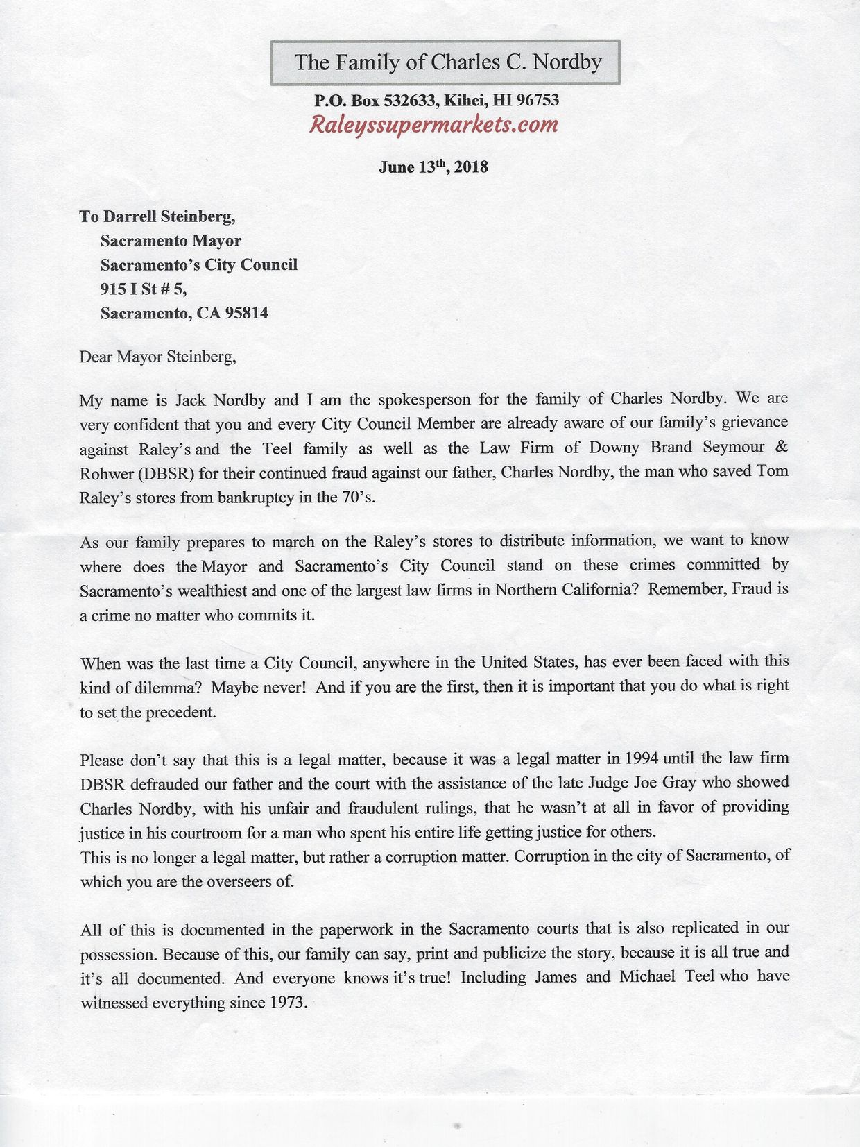 Letter to Mayor Darrell Steinberg on 6-13-2018