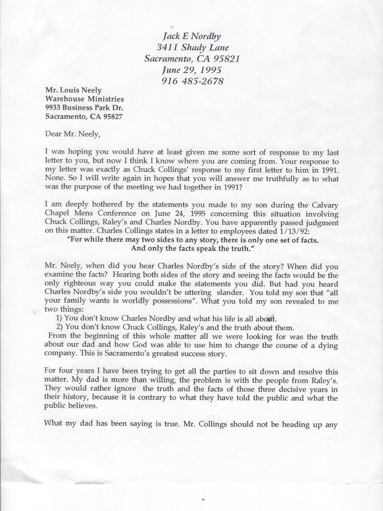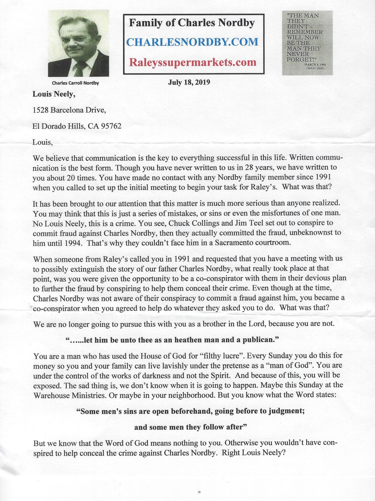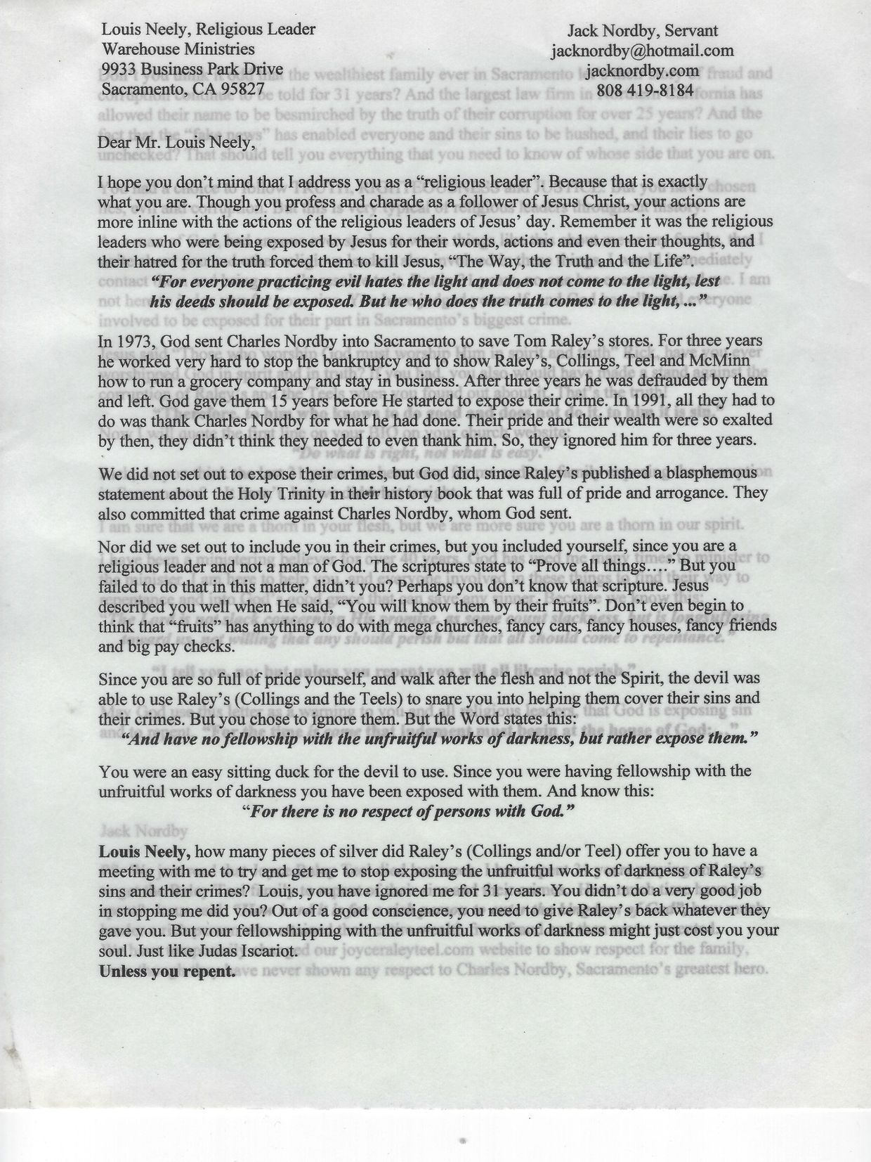 Raley's somehow got to Louis Neely. We just don't know if they bribed Louis Neely or what, but for 34 years Louis has remained silent. Look at some of the letters written to him in an attempt to find out why he did what he did.